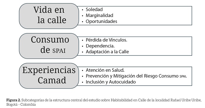 Durante el análisis de las entrevistas emergieron una serie de categorías que permitieron una clasificación inicial de la información. De acuerdo con los pasos de interpretación y análisis, aparecen las categorías y subcategorías. Este ejercicio permitió elaborar una estructura de las experiencias relatadas por los habitantes de calle con respecto a la atención en salud durante el periodo de atención de los Camad, el consumo de spai, y la vida en la calle (figura 1).