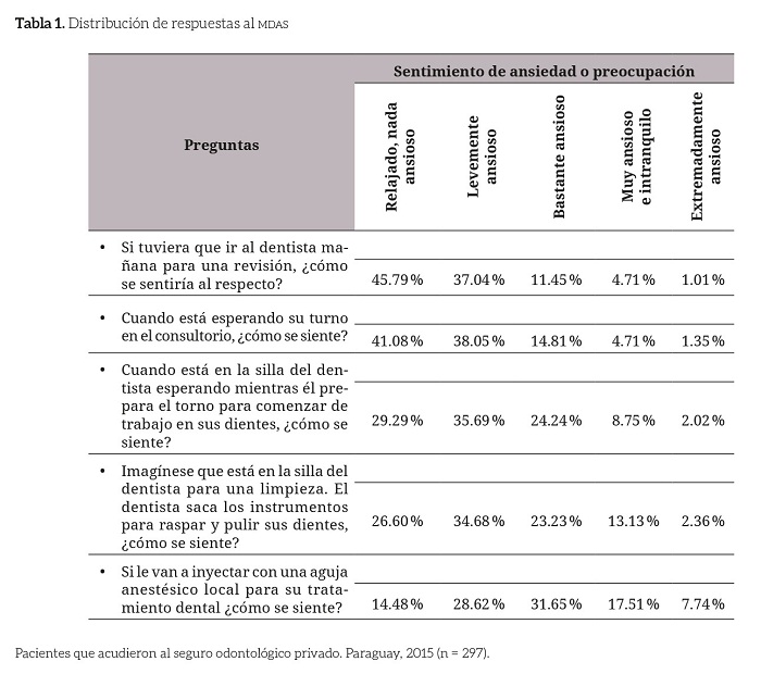 Resumo: Introdução: a ansiedade dental ou medo ao tratamento odontológico, é uma das dificuldades mais frequentes para o profissional, que pode ter impacto na saúde oral. O objetivo é avaliar o nível de ansiedade dos pacientes que acudiram às consultas na clínica odontológica de uma empresa privada de serviços odontológicos, no ano 2015. Materiais e métodos: estudo transversal no qual utilizou-se a Escala de Ansiedade Dental de Corah Modificada (mdas), e se interrogou sobre a ansiedade que geram os componentes da consulta odontológica. Resultados: participaram um total de 297 adultos dos quais 54.85 % foram homens e a idade média foi 28 anos. Obteve-se um número baixo de pacientes com ansiedade extrema (7.74 %), senda a porcentagem mais elevado para a injeção de anestésico local (85.52 %). O 17.85 % obteve um nível de ansiedade elevada e o 17.85 % severa. O componente da consulta odontológica que gerou maior nível de ansiedade foi a extração dental com 40.40 %. Conclusão: o paciente deve se sentir o mais relaxado possível ao ir a uma consulta odontológica pelo que precisam-se conversas aos provedores de saúde dental acerca das diferentes técnicas para diminuir a ansiedade dental do paciente.