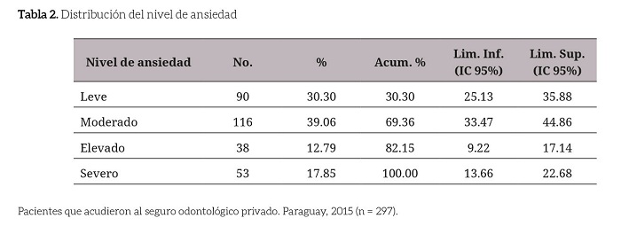 Se concluye que prevaleció un nivel moderado de ansiedad, aunque no alcanzó a ser mayoría; se encontró un bajo número de pacientes con ansiedad extrema y los que la presentaron, en general, refirieron la inyección de anestésico local para el tratamiento dental como el detonante principal.