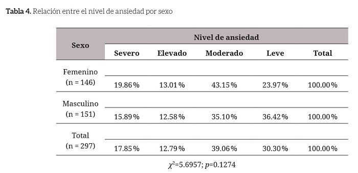 Los niveles de ansiedad severo, elevado y moderado fueron ligeramente superiores para el sexo femenino, mientras que el nivel leve fue ligeramente superior para el sexo masculino (tabla 4), pero estas diferencias no resultaron estadísticamente significativas.