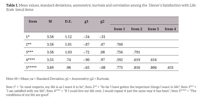 The initial analysis helped calculating descriptive (average, standard deviation) and distribution (asymmetry and kurtosis) measures for each of the five swls items. The Mardia’s multivariate normality coefficient was calculated, thus contributing to the decision of the most appropriate estimation method (62).
