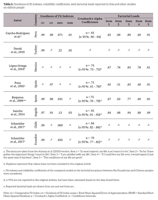 The study presents certain limitations, such as the low number of elderly participants that came from a single city, this would lead to the recommendation to carry out other swls validation studies in bigger samples of other cultural groups in Peru. Likewise, for practical reasons, participants were non-institutionalized ep, mostly living with their families or relatives, it is therefore necessary to analyze the swls psychometric evidences in ep who are institutionalized or in clinical settings. On the other hand, this study used a series of self-reporting measures, leading the results to be prone to bias. Ultimately, the test-retest reliability was not assessed in the present study.