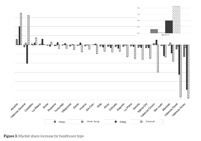Figure 3 shows how the highest inter-department patients’ flow is found in outpatient consultation and in medical emergencies. When differentiating by healthcare department, we establish that the only concession that can increase its market share in all the analyzed healthcare types is La Ribera. Torrevieja achieves positive values in ambulatory surgery and emergencies, with a slight fall in hospitalization and a more notable decline in outpatient consultations. The same pattern is observed in the concessions of Elx-Crevillent and Denia, and in the latter is a slight decrease of the market share in relation to the ambulatory surgery. In this way, we can establish how the different departments show the same population market share for all healthcare types. Ultimately, Manises has a reduced market share in all healthcare types except for ambulatory surgery.