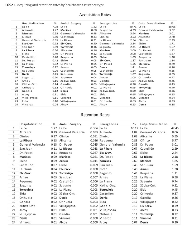 First, the reading of the ranking (table 1) by healthcare type (columns) determines that the highest patient acquisition takes place in medical emergency and outpatient consultancy, and in a lower degree in hospitalization and ambulatory surgery. This is due basically to the particularity of these healthcare types, so that most typically the patient comes to emergency or outpatient consultancy a higher number of times than the times he/she is hospitalized or undergoes ambulatory surgery.