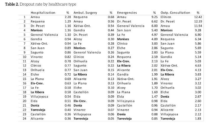 According to table 2, the highest dropout rates are registered by the outpatients consultation, followed by emergencies (columns). Regarding the healthcare management model (rows) we established that the departments with partnership management have relatively low positions, especially by hospitalization and ambulatory surgery. However, we found big differences in the behavior of this rate among the public-private concessions. Manises shows a high patient dropout rate, while Denia and Torrevieja present very low dropout rates, whereby the latter concession is the Healthcare Department with the lowest dropout in ambulatory surgery, emergencies and outpatient consultations.