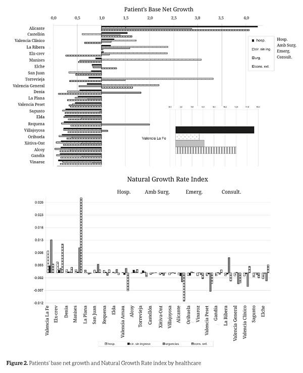There is an irregular growth in the net patients’ base, where three departments increase their base in all healthcare departments, whereas 11 departments showing a reduced net patients’ base in all healthcare types, thus causing direct repercussions in terms of management, since the number of attended patients decreases, especially if the department revenues directly depend on the patient attendance, as it is the case of the capitation and the interinstitutional turnover financing models, which is the existing scenario in the Valencian Community.