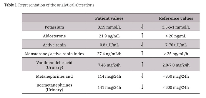 The authors describe the clinical case of a 63-year-old male patient who presented with a severe hypertension with five years of evolution, treated with four antihypertensive agents (nifedipine 60mg daily, losartan 100mg daily, nebivolol 5 mg daily, and rilmenidine 1mg daily) introduced sequentially, maintaining systolic blood pressure [bp] greater than 170 mmHg, with progressive worsening in the last two years. He is an autonomous patient, with history of non-insulin treated type 2 diabetes mellitus and a stroke, four years previously, without chronic sequelae. In the etiological study of hypertension, several analytical alterations were identified, and they are explained in table 1.