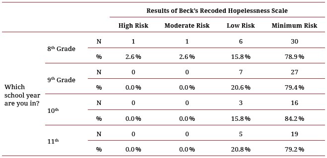 Beck’s Hopelessness Scale, in a Spanish adaption by Aguilar, Hidalgo, Cano, Lopez, Campillo and Hernandez (18, 19). It is a self-applied scale of 50 reactants, to be answered “true” or “false” as applicable. Hope and vision of future were assessed according to negativist or positivist valuations. With this scale the type of suicide risk can be evaluated, consequently, the findings were quantified in a scale from “minimum” through “high risk” of committing suicide.