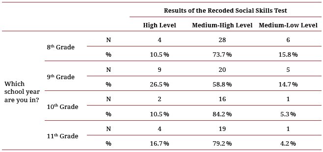 Data behavior describes a sample with a high trend to have social skills and a minimum suicide risk (table 1, 2 and 3), especially in the ninth grade. Nevertheless, the 8th grade data presented dispersion, one person with high suicide risk was identified.