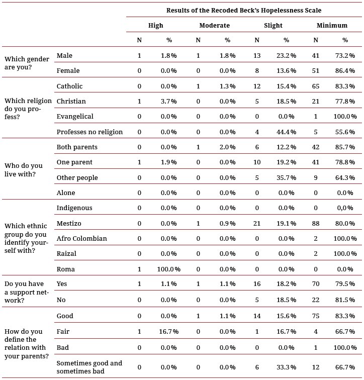 Gonzales et al. found, in turn, in a study with a similar population as the one in this research exercise, that “suicidal risk in the assessed population is associated with intrafamily tension when one of the parents exerts an inappropriate normative control”, thus establishing once again the way in which the family is implied in the possibility of making adolescents vulnerable when there is a significant level of dysfunction (29).