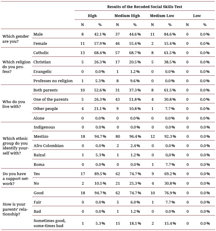 Based on the presented results, it would be time to start thinking about forms of intervention in adolescents, considering that it is fundamental to gain social skills in solving problem situations. Gonzalez, Ampudia and Guevara have designed a model of intervention of this population by specifically approaching the construction of social skills in childhood and adolescence, but, as this research shows, the family factor plays a far more important role, so that the individual and group intervention forms should be oriented to the family: it is within the family, acting as a bridge and a promoter of healthy individuals, where the real social skills must be gained, or at least, where the process of strengthening the basic skills should be furthered (27).