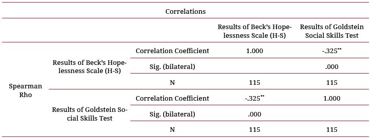 It is apparent that the high hopelessness rate in specific cases is associated with a fair relation with the parents; besides, the only case with a high level of hopelessness lives with one parent and says that he has a fair relation with him. Data provided in table 4 show a high trend of having social skills. As relevant information it was established that in women there is a higher punctuation in the item social skills. Also, those who have both parents registered a higher punctuation in that item.