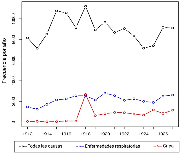 Nota: se representa la mortalidad por todas las causas (línea negra), por enfermedades respiratorias excluyendo gripa (línea azul) y gripa (línea roja). En 1918 se evidencia un incremento en la frecuencia de muerte por gripa.
