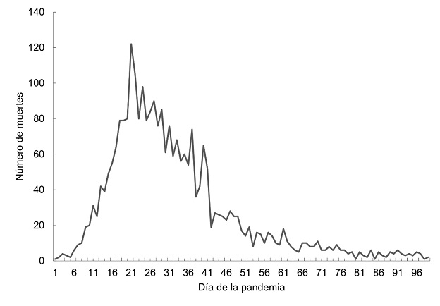 Este periodo inició con la muerte de un niño en Tunja el 25 de octubre de 1918. El día 21 de la pandemia (14 de noviembre de 1918) se registraron 122 muertes en 65 municipios, la mayor cantidad de decesos de la epidemia que ocurrieron en un solo día. Hasta esta fecha, que corresponde al pico pandémico, se habían registrado en total 741 muertes. A partir del día 71 de la pandemia (10 de enero de 1919), las muertes se redujeron a menos de 10 por día (figura 2).