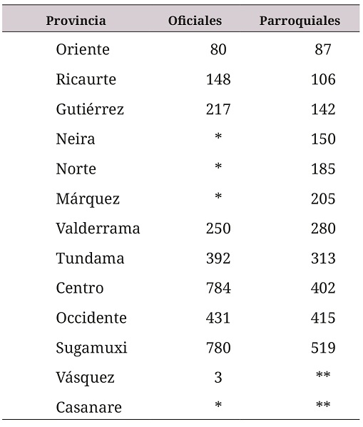 En la tabla 1 se observa la mortalidad por gripa en las provincias de Boyacá, a partir de los informes oficiales y de los registros parroquiales, siendo complementarios para realizar una interpretación del impacto de la pandemia. El impacto de la mortalidad evidenciado en los informes oficiales y los registros parroquiales es similar, siendo las provincias de Occidente, Oriente y Valderrama las que mayor similitud presentan; en las provincias de Centro, Gutiérrez y Ricaurte los datos son más disímiles, debido al subregistro por no tener acceso a la totalidad de las parroquias, exceptuando la provincia de Valderrama, que presenta más muertos en los registros parroquiales. También es importante resaltar que las provincias con mayor mortalidad son Sugamuxi, Occidente y Centro, coincidentes en las dos fuentes presentadas.