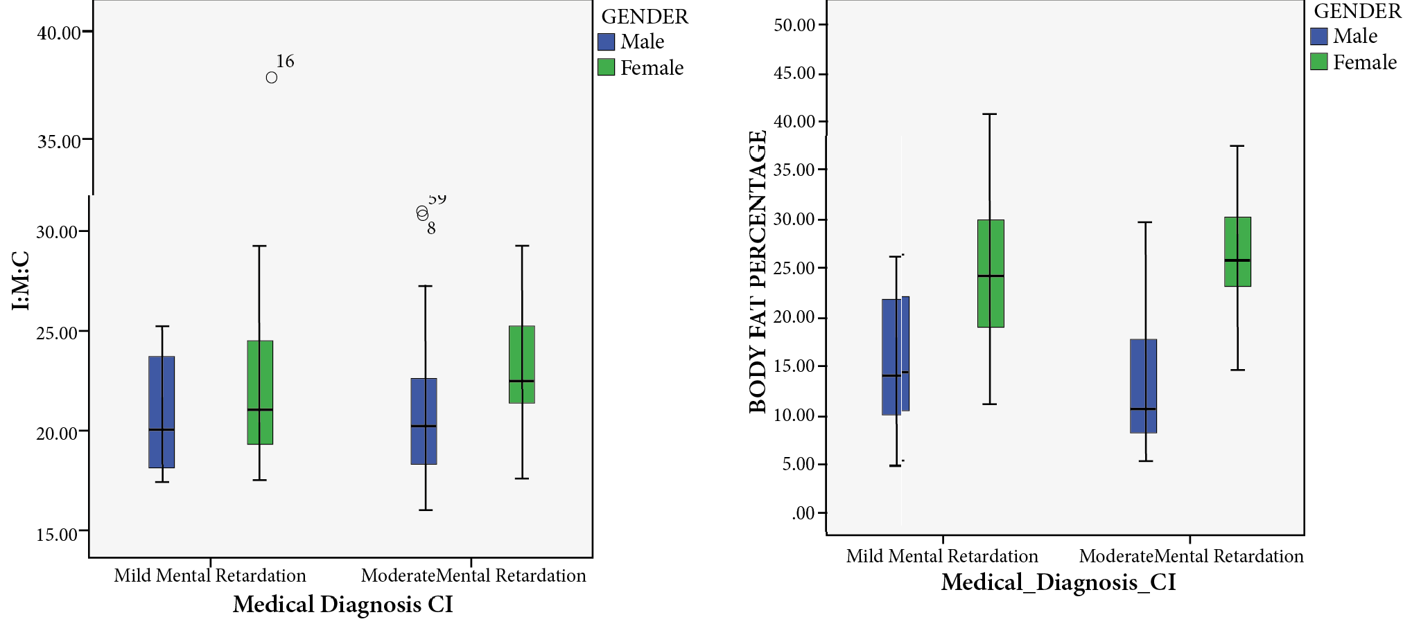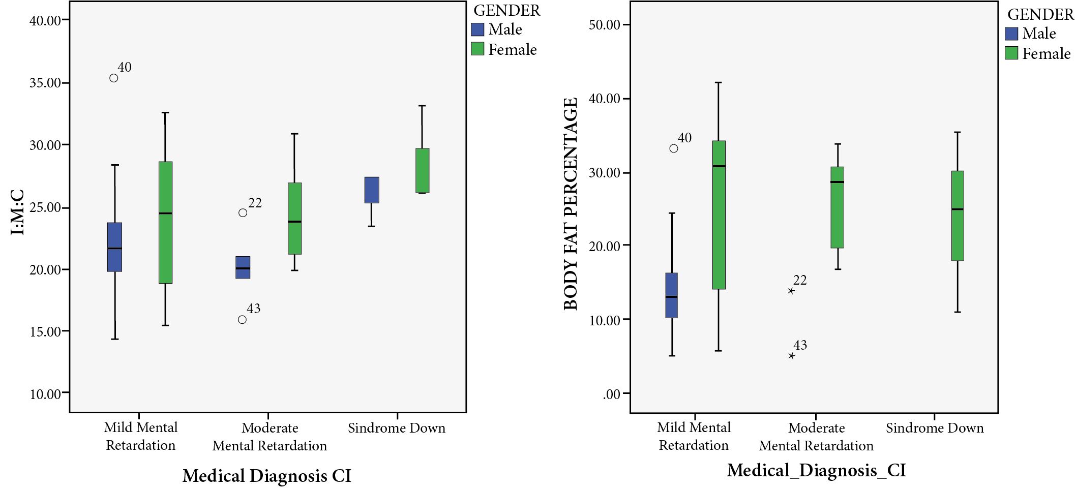 Source: The authors.In population older than 18 years a third diagnosis comes up, Down syndrome (DS), which was not present in the population aged under 18 years. In this population cardiovascular risk is higher in those diagnosed with ds, since it is clear that their physical fitness shows poor and low results, while the anthropometric variables lie over the overweight and obesity levels, determined based on waist circumference, body fat percentage and BMI. Body fat percentage for males in general are found in normal valuation ranges, even though there are differences by diagnosis, showing a higher percentage in those diagnosed with ds. By contrast, females register high, and obesity values, higher than in females diagnosed with mild id (figure 2).