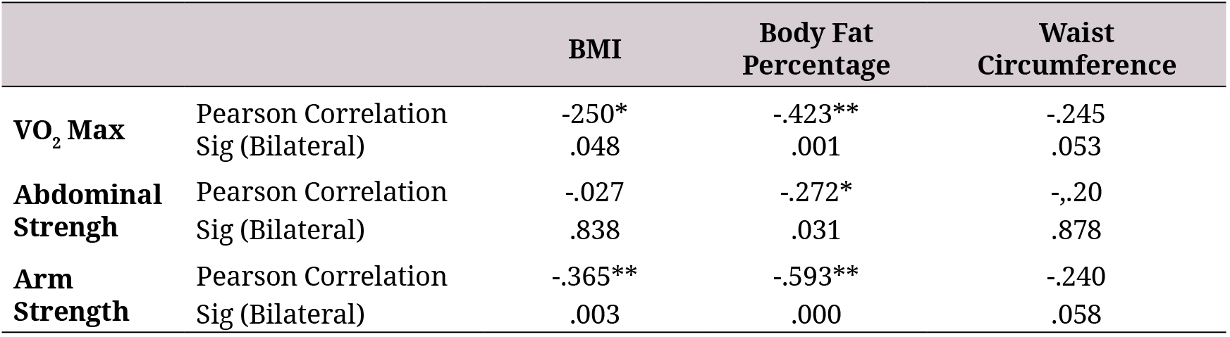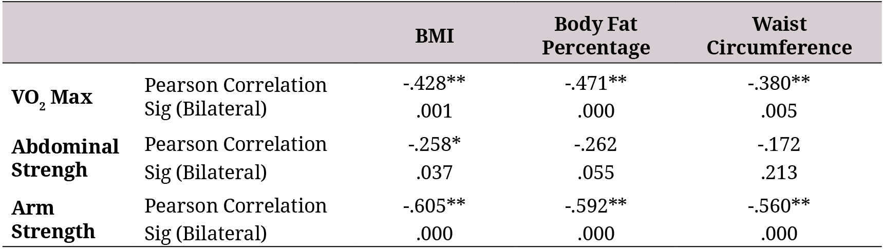 As to the relations between the physical fitness variables and the indirect variables with cardiovascular risk associated with adiposity, a significative and inversely proportional correlation between body fat percentage and force of the upper limbs (r = 0.593, p = 0.01) was found; as it is between body fat percentage and abdominal strength (r = 0.27, p = 0.01); as well as with aerobic capacity (-0.423, p = 0.01). In this population, waist circumference and BMI did not present any correlation with the physical fitness variables, where the body fat percentage could be considered the main risk predictor (table 1).