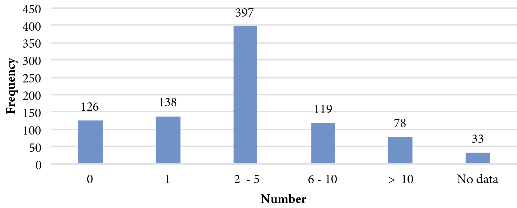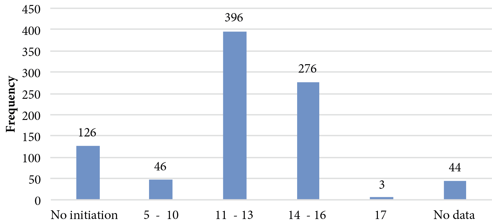 Among the obtained results, 891 reports were established in the research period. Average age of the young females was 15.24 years (sd: 1.33), in a range between 11 to 18 years. Initiation of sexual relations was between 5 and 17 years of age; 75 percentile corresponds to 14 years of age, and 25 percentile to 12 years (mean = 13, interquartile range = 2) (figure 1); 126 adolescents (14.1 %) expressed never having had sexual relations. The number of sexual partners varied between 0 and 120. The highest frequency laid in the interval between 2 and 5 (figure 2).