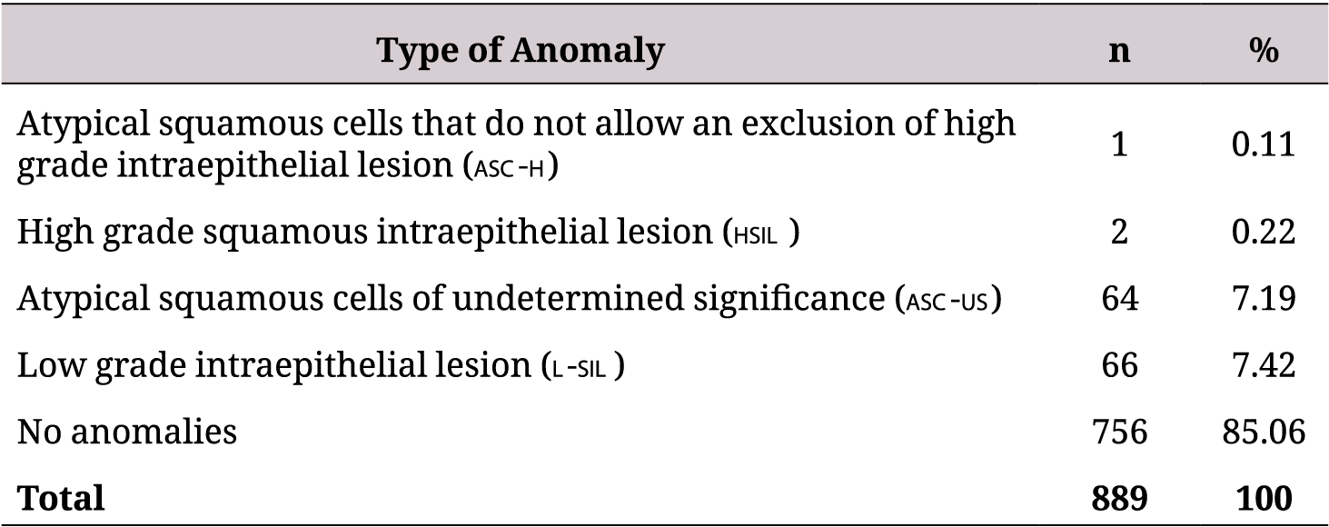The cytology results according to the Bethesda classification showed anomalies in the squamous cells of 15.04 % of patients (n = 134). The frequency of hsil was 0.2 % corresponding to two patients (table 2).