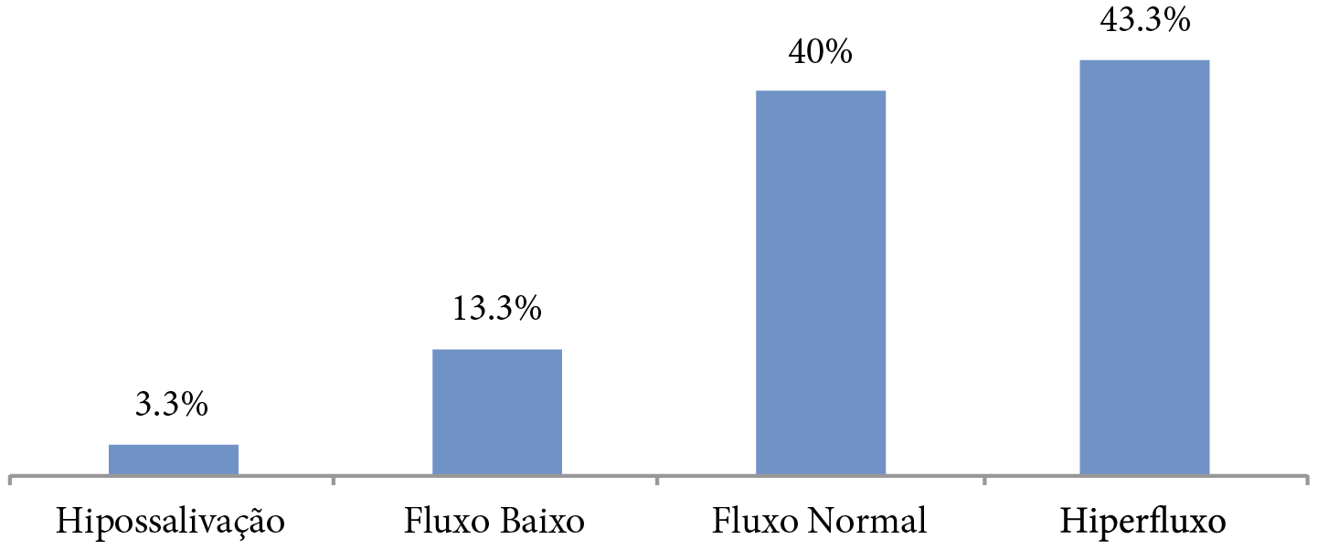 Quanto ao fluxo salivar em repouso do grupo estudado, foi observada média de 0.44 ± 0.34 ml/min. Nota-se que 40 % (12) dos pacientes apresentavam fluxo normal, 43.3 % (13) tinham hiperfluxo, e em apenas 3.3 % (1) havia a presença de hipossalivação (figura 1). O pH salivar teve média de 6.47 ± 0.57, 56.6 % (17) dos pacientes apresentaram pH salivar neutro e 40 % (12) pH baixo (pH 6.0).