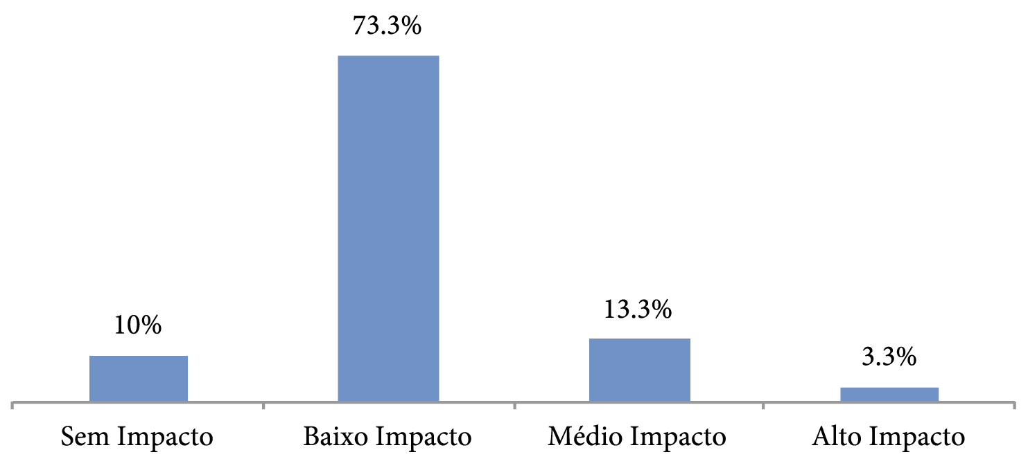 No que se refere à QVRSB avaliada pelo OHIP-14, foi obtida uma média de 5.54 ± 4.93 através do método ponderado, correspondendo a um baixo impacto. Os resultados demonstraram que em 90 % (27) dos pacientes houve algum impacto das condições bucais na qualidade de vida, sendo que a maioria (73.3 %) correspondeu a uma classificação de baixo impacto (figura 2).