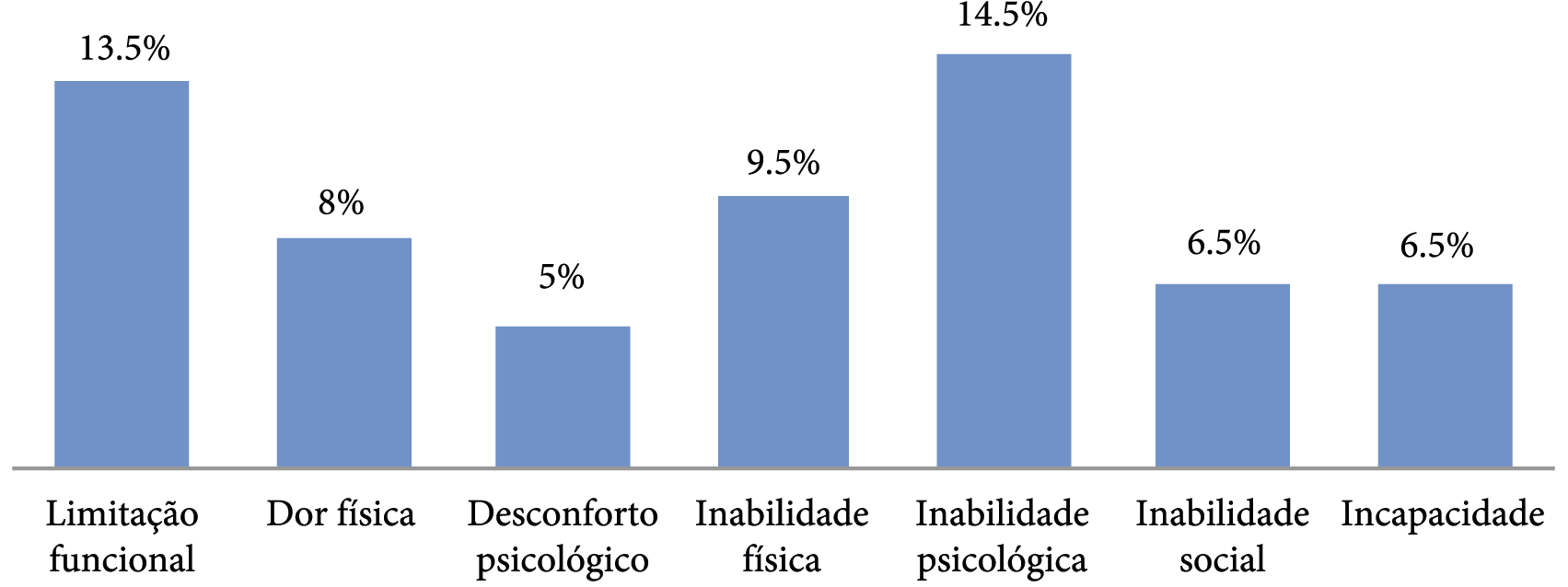 De acordo com os resultados do OHIP-14 obtidos pelo método da simples contagem, foi observado que as dimensões que apresentaram maiores percentuais foram a inabilidade psicológica (14.5 %) e a limitação funcional (13.5 %), enquanto que desconforto psicológico foi a dimensão que menos influenciou (5 %) na QVRSB dos pacientes avaliados, conforme observado na figura 3.