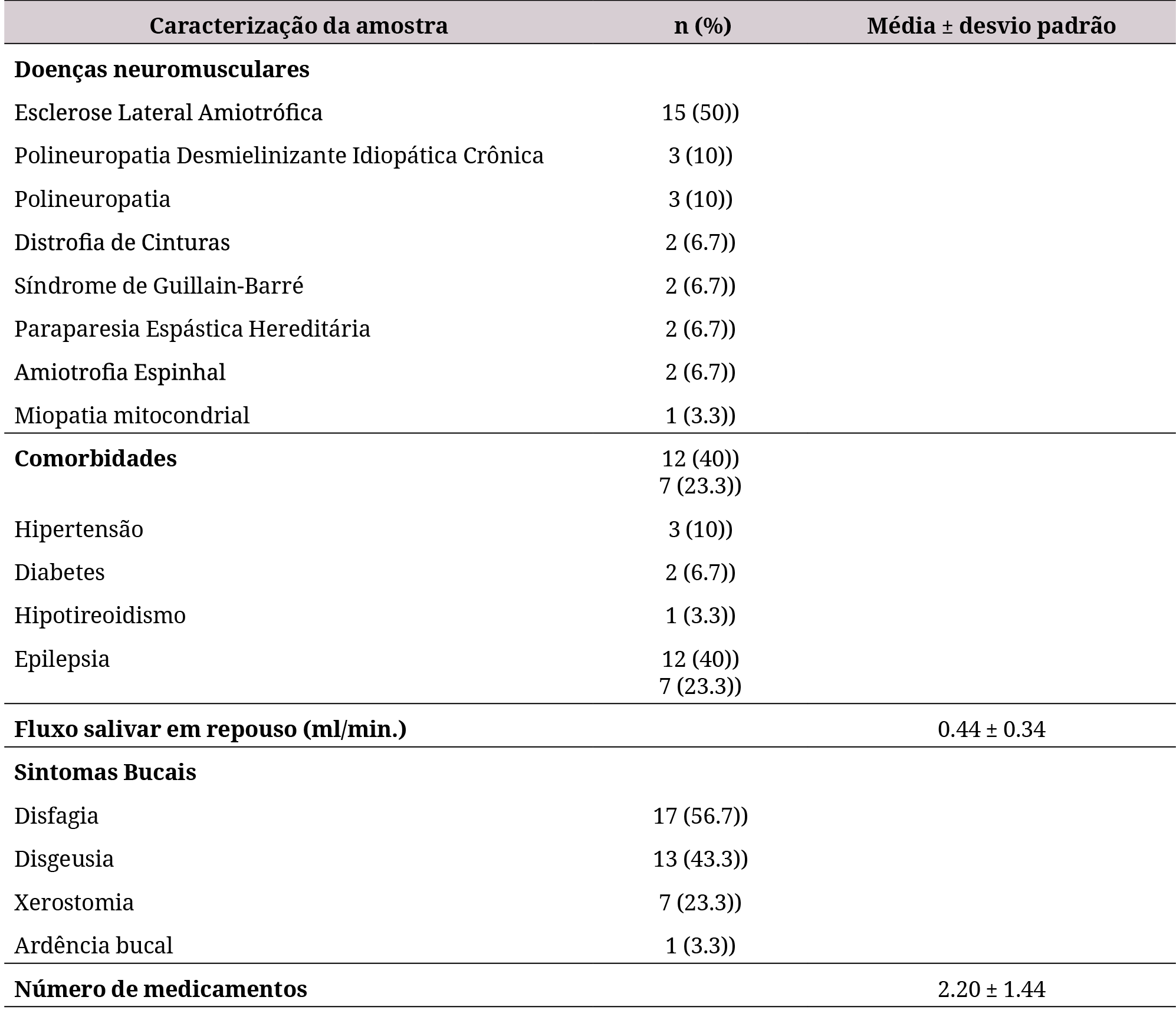 A média de idade entre os indivíduos da amostra estudada foi de 49.7 ± 13.3 anos e 56.7 % (17) eram homens. Dentre as doenças de base apresentadas, a ELA foi a mais prevalente, correspondendo a 50 % (15) da amostra. Dos pacientes avaliados, 40 % (12) possuíam pelo menos uma comorbidade, onde 23.3 % (7) dos casos corresponderam à hipertensão arterial e 10 % (3) a diabetes. Com relação ao uso de medicamentos constatou-se que mais de 40 % (13) dos pacientes faziam uso de três a cinco medicamentos diferentes ao dia. Os medicamentos mais utilizados foram: agente antiglutamatérgico (43.3 %), antidepressivos (36.7 %) e anti-hipertensivos (26.6 %).
