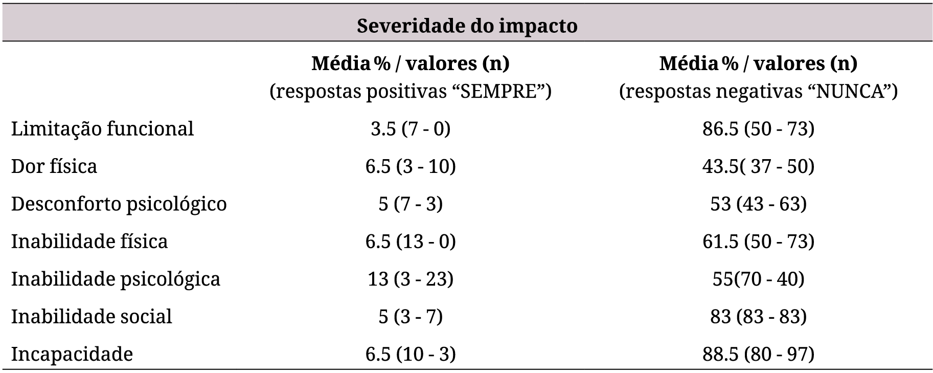 Na análise da gravidade dos impactos do OHIP-14 observou-se que a dimensão com maior média de frequências positivas, representadas pela resposta “sempre”, foi a dimensão inabilidade psicológica (13 %). Em contrapartida, para os somatórios de frequências negativas relativas à resposta “nunca”, os maiores percentuais foram para as dimensões incapacidade (88.5 %) e limitação funcional (86.5 %), de acordo com a tabela 2.