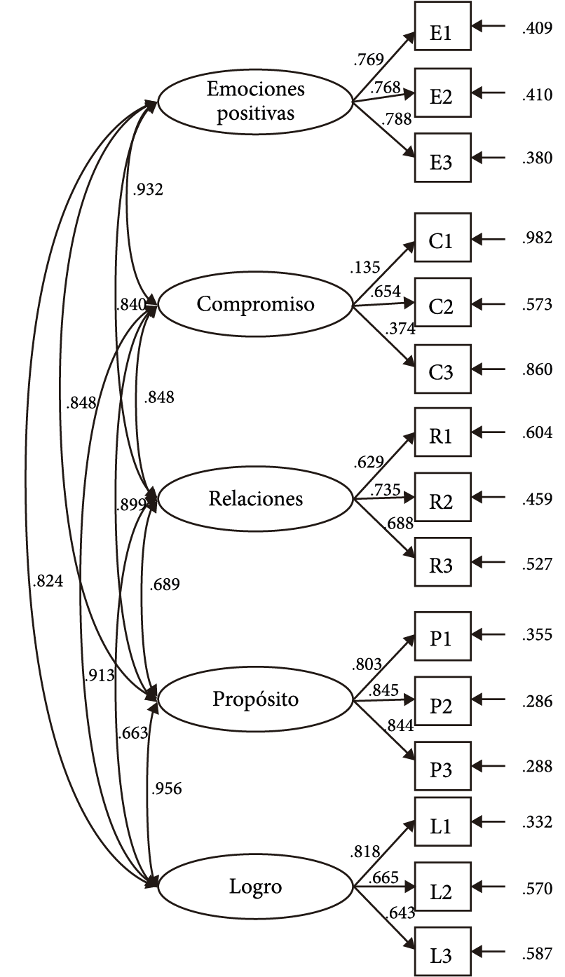 Los cinco factores propuestos para el análisis presentaron cargas significativas para cada dominio, lo cual confirma las dimensiones de (a) emociones positivas, (b) compromiso, (c) relaciones positivas, (d) propósito y (e) logro. Se presentan altas cargas para la mayoría de los elementos que integran el cuestionario, a excepción del ítem C1: “¿Con qué frecuencia te sientes absorbido(a) en lo que estás haciendo?”, que pertenece a la dimensión de compromiso (figura 1).