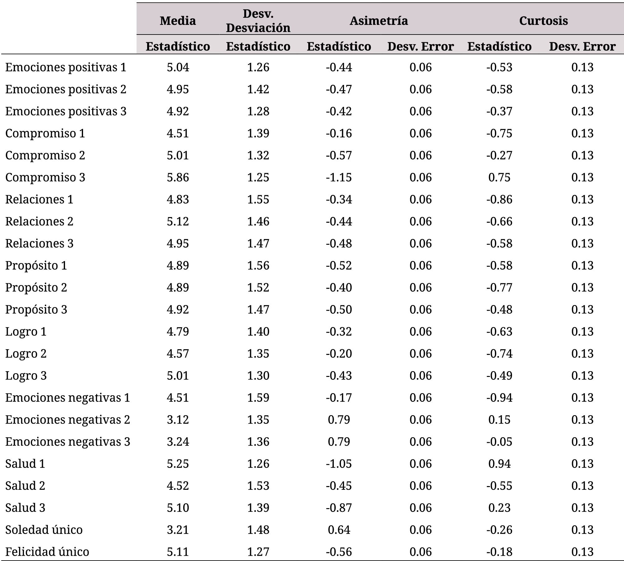 A continuación, se presentan los estadísticos descriptivos de los veintitres ítems que componen la escala PERMA-Profiler (tabla 2). Se obtuvieron puntuaciones bajas en los ítems pertenecientes a la dimensión de emociones negativas y para el ítem que evalúa la percepción de soledad; esto indica una menor presencia de estos aspectos en la vida de los estudiantes universitarios.