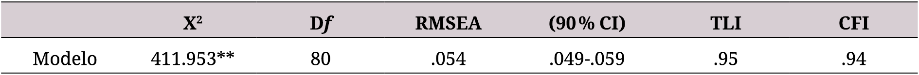 Los resultados indicaron un adecuado ajuste del modelo. Se presenta un valor de chi-cuadrado significativo (esperable en muestras grandes), el RMSEA se encuentra dentro del rango recomendado (.05-.08), al igual que los índices de ajuste alternativo de Tucker-Lewis y ajuste comparativo (.90-.95) (34, 35).