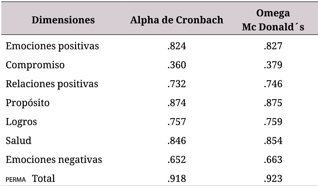 El PERMA-profiler es un cuestionario que evalúa las dimensiones del PERMA además de una medición global del constructo del bienestar (18). Los autores de esta escala señalan resultados favorables en términos psicométricos, pues tiene índices adecuados de consistencia interna, así como una estructura factorial similar a la propuesta teórica (21). Adicionalmente, se han publicado otros estudios de validación del PERMA-Profiler; por ejemplo, en Estados Unidos se realizó una validación en una muestra de estudiantes veteranos, en la cual los autores reportaron adecuados índices de fiabilidad y validez del instrumento (29). En Malasia, 342 participantes, de los cuales el 50 % eran estudiantes, completaron el PERMA-Profiler. El análisis factorial exploratorio con el método de componentes principales y rotación oblimin reportó una estructura de tres factores (emociones / relaciones positivas, significado / logro y compromiso) (25).