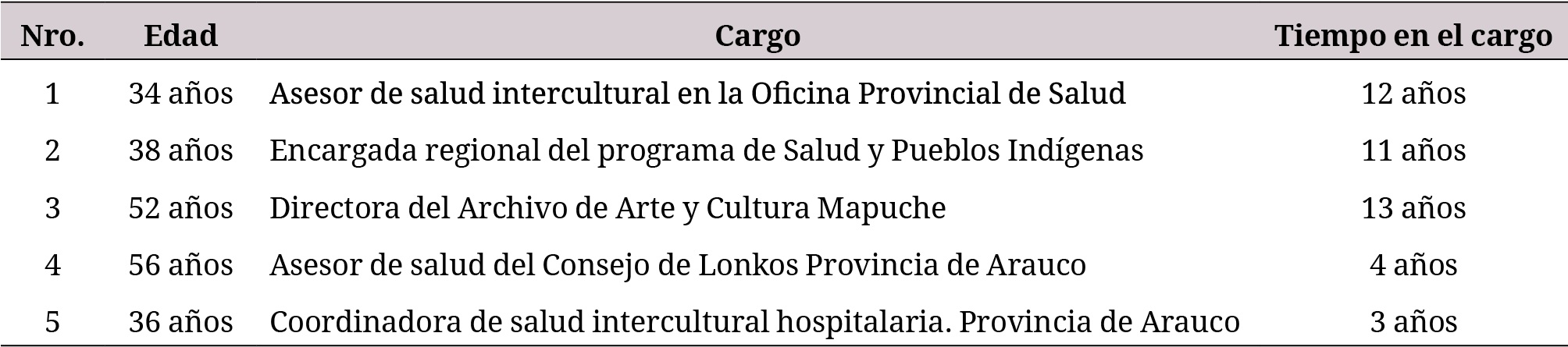 En cuanto a los participantes de este estudio, se incluyeron a diez usuarios, todos ellos de origen mapuche, con residencia en Tirúa o Cañete, y que asisten de forma regular a los respectivos centros de salud. Participaron, además, quince técnicos y profesionales de la salud del área de obstetricia, medicina, psicología, kinesiología, tecnología médica y enfermería, con permanencia laboral mínima de un año en los centros de salud locales. Asimismo, se entrevistaron dos facilitadores interculturales. El facilitador intercultural es un miembro del pueblo mapuche que trabaja en los centros sanitarios, y que da orientaciones culturales al equipo de salud y que gestiona las necesidades específicas de los usuarios mapuche. Finalmente, se entrevistó a cinco informantes clave de amplia trayectoria, entre los cuales se incluyeron expertos mapuche en la materia, autoridades ancestrales y encargados del programa de salud intercultural a nivel comunal, provincial y regional. Se provee una caracterización de los informantes clave en la tabla 1.