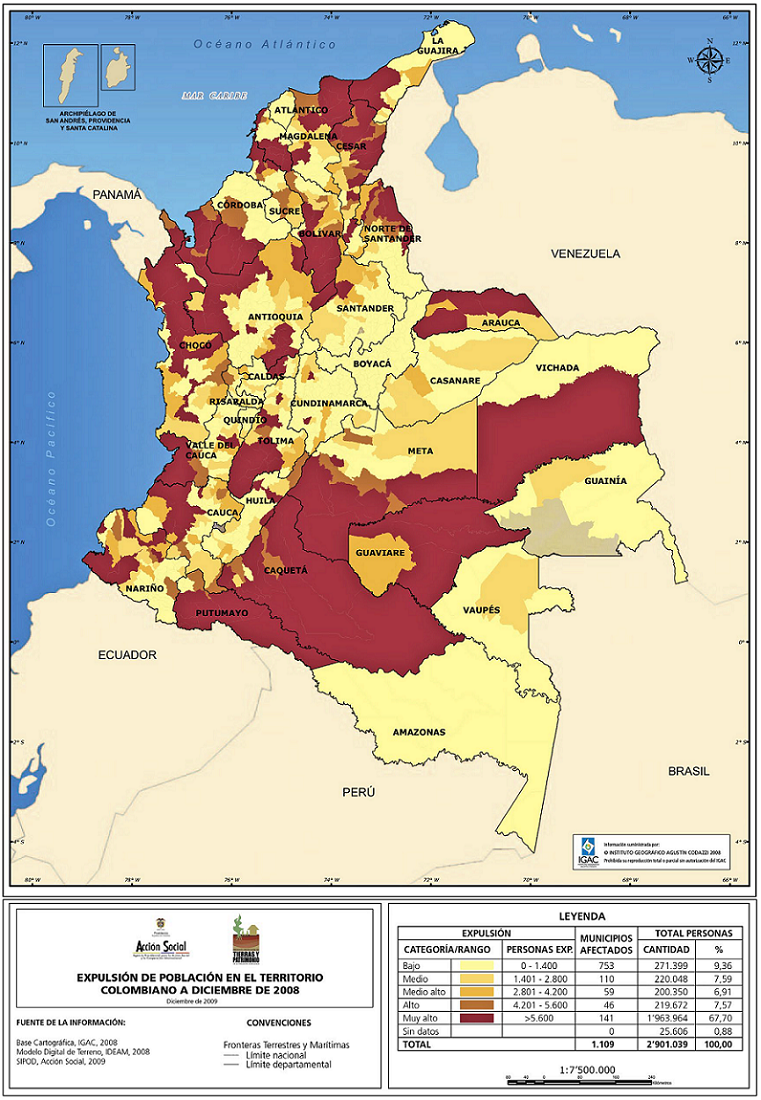 Como se puede observar en el mapa, a diciembre de 2008, hay 141 municipios con desplazamiento muy alto, de los cuales fueron expulsadas casi 2 millones de personas, que suman el 67.7 % del total. Dentro de estos municipios los más críticos han sido Buenaventura, El Charco y Tumaco en el suroccidente; Santa Marta, Fundación y Ciénaga en el Caribe; Tame en el oriente, por mencionar solo algunos. Hay 753 municipios clasificados como de desplazamiento bajo ubicados principalmente al suroriente y centro del país, y solamente hay 13 municipios situados en los departamentos de Cundinamarca, Boyacá y Guainía que no registraron expulsión de personas en dicho período, porcentaje mínimo respecto al total del país, que cuenta con 1101 municipios. Es decir, la mayor parte de Colombia se vio afectada por el desplazamiento, que estuvo acompañado, en una proporción importante, por despojo de tierras y territorios.