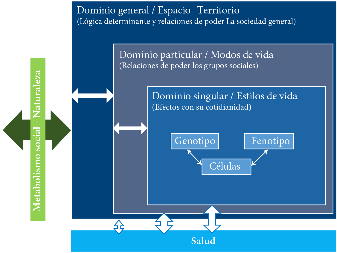 El dominio general corresponde a la dimensión constituida por los procesos estructurales y super-estructurales de la sociedad, que definen los patrones sociales asumidos como leyes universales o generales, lo que lo convierte en la esencia de la determinación de todas las dimensiones y le permite delimitar el movimiento de los procesos particulares y de los procesos singulares. Esto quiere decir que lo general, lo reiterado, lo relativamente estable y común a toda situación de salud y enfermedad depende dialécticamente de leyes generales que regulan la dimensión estructural, super-estructural de la sociedad (14).