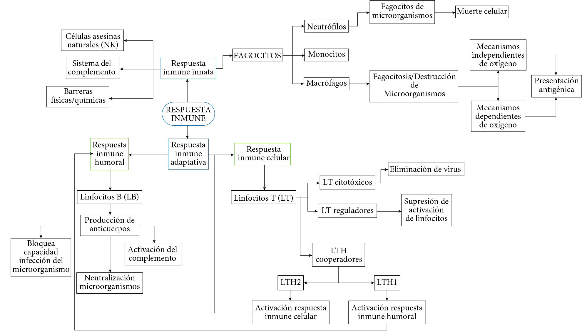Para entender mejor este sistema, se muestra a continuación un diagrama de la división de la respuesta inmune (figura 3). Se debe tomar en cuenta que esto es con fines didácticos, puesto que este sistema es el mejor ejemplo de jerarquización y subsunción de mecanismos que conforman una totalidad provida.