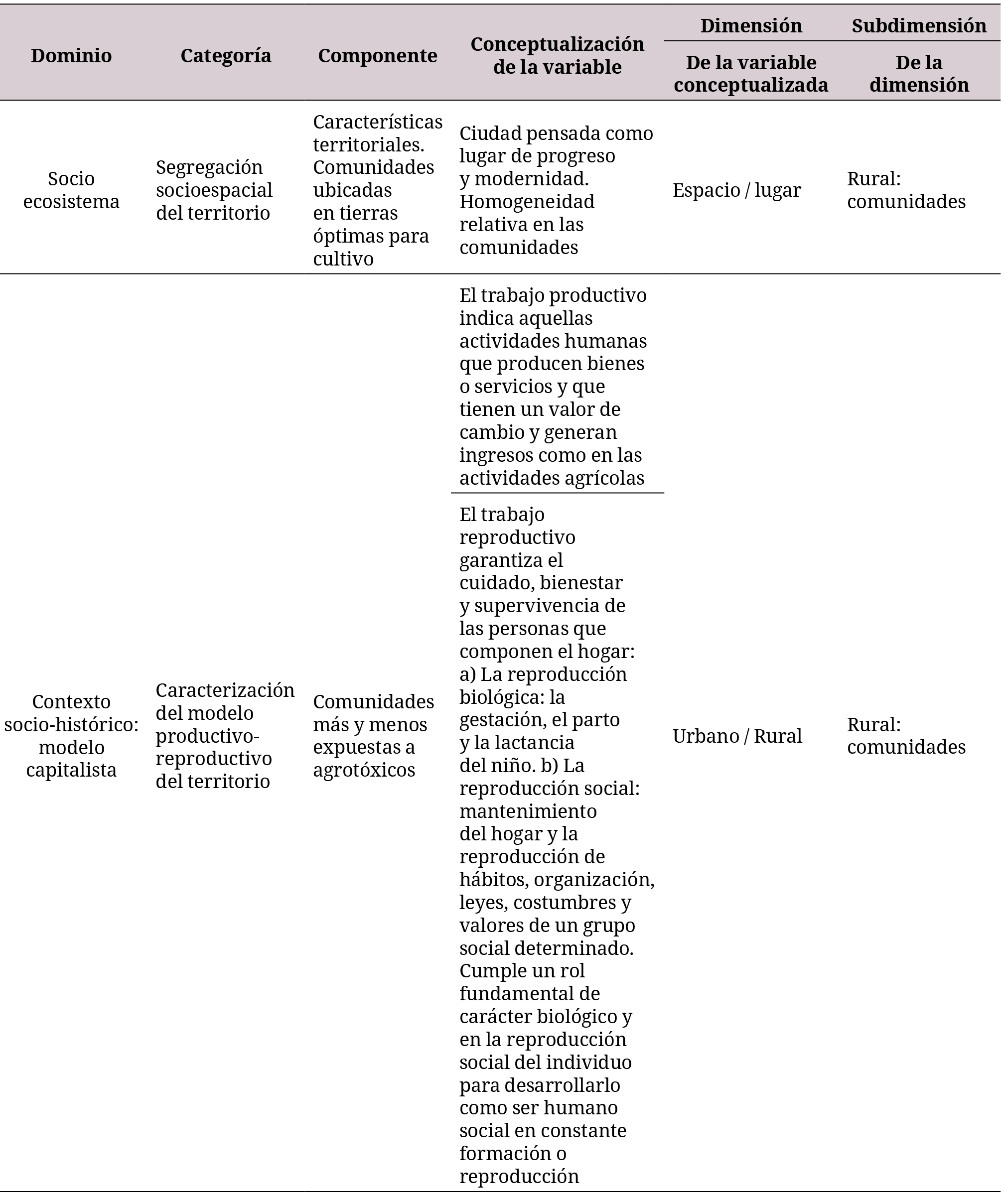 Aplicando la matriz de procesos críticos diseñada por Breilh, el análisis de este modelo teórico en comunidades con mayor y menor exposición a agrotóxicos se observa en la tabla 1.