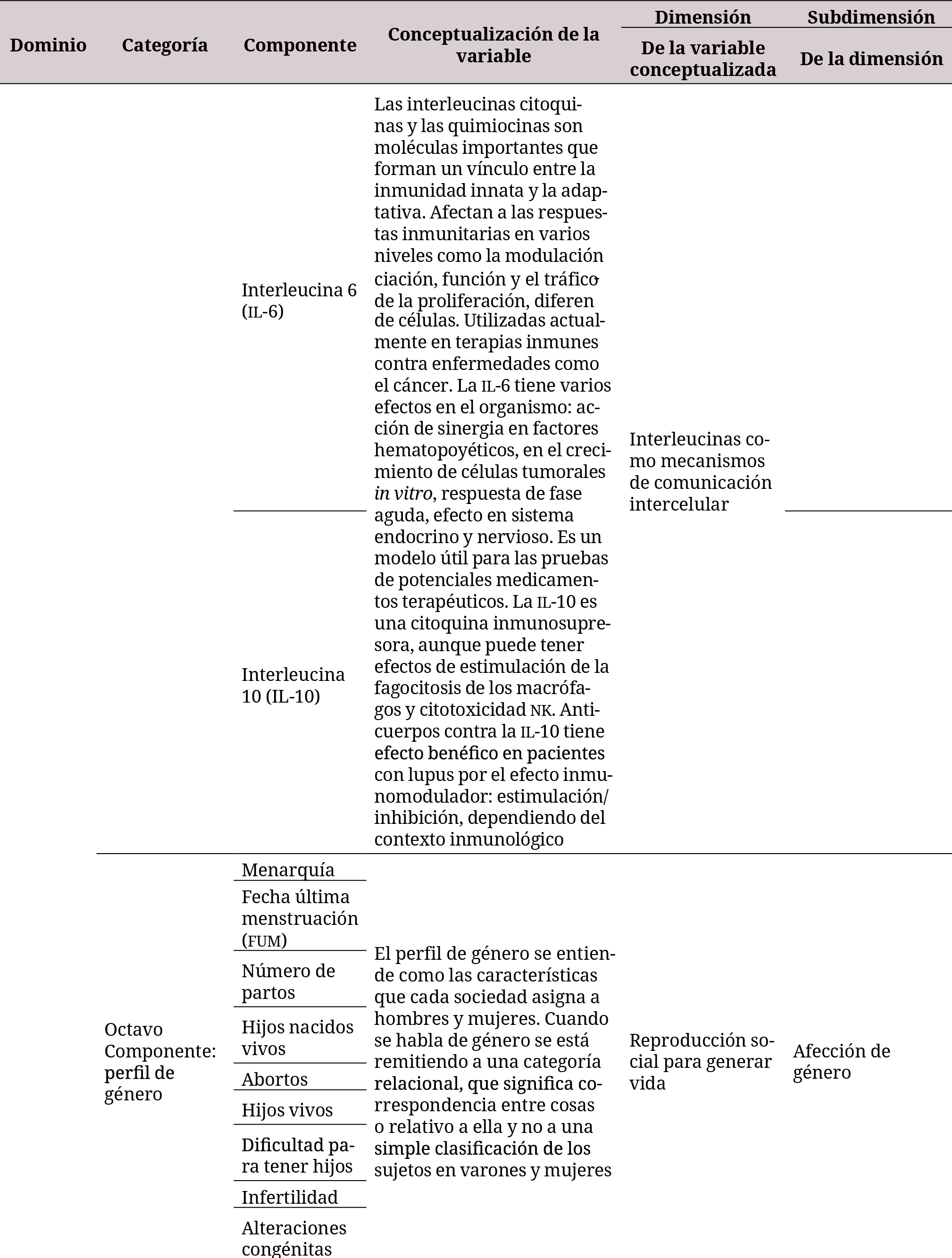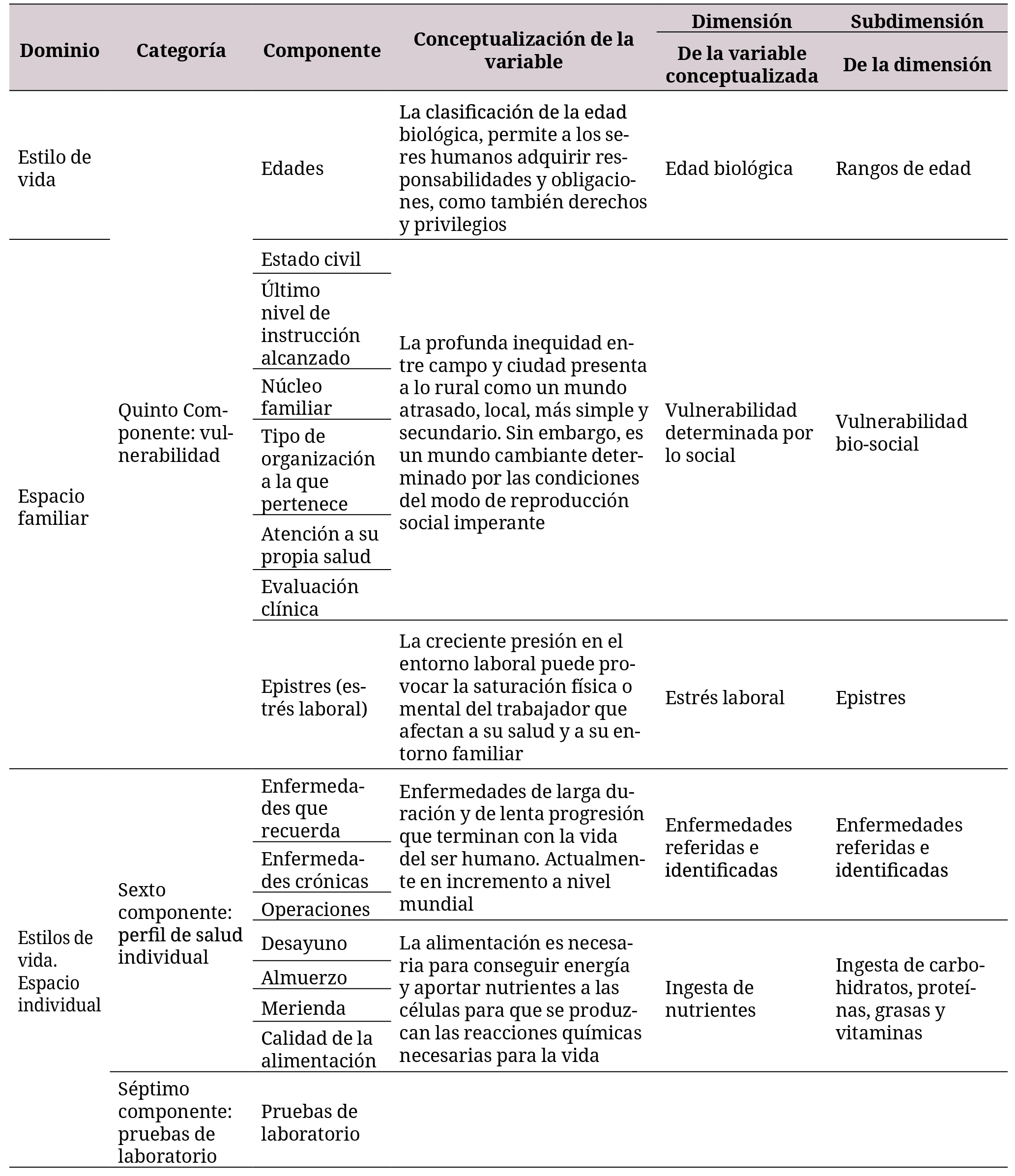 El dominio singular está íntimamente relacionado con la condición y situación individual en la que se expresan las determinaciones sociales particulares y universales. La dimensión que regula es el individuo, pero no en abstracto, sino perteneciente a un grupo social determinando en sus condiciones de vida por los procesos estructurales y super-estructurales de la sociedad. Este organismo concreto definido en sus características biológicas, psíquicas y sociales es en el que se manifiesta la salud-enfermedad (12). En este dominio las relaciones y prácticas sociales se estructuran en los estilos de vida, que involucran la fuerza de trabajo, la producción cultural, la producción simbólica y la ideológica (15). En la siguiente tabla se describen los componentes involucrados en el dominio singular.
