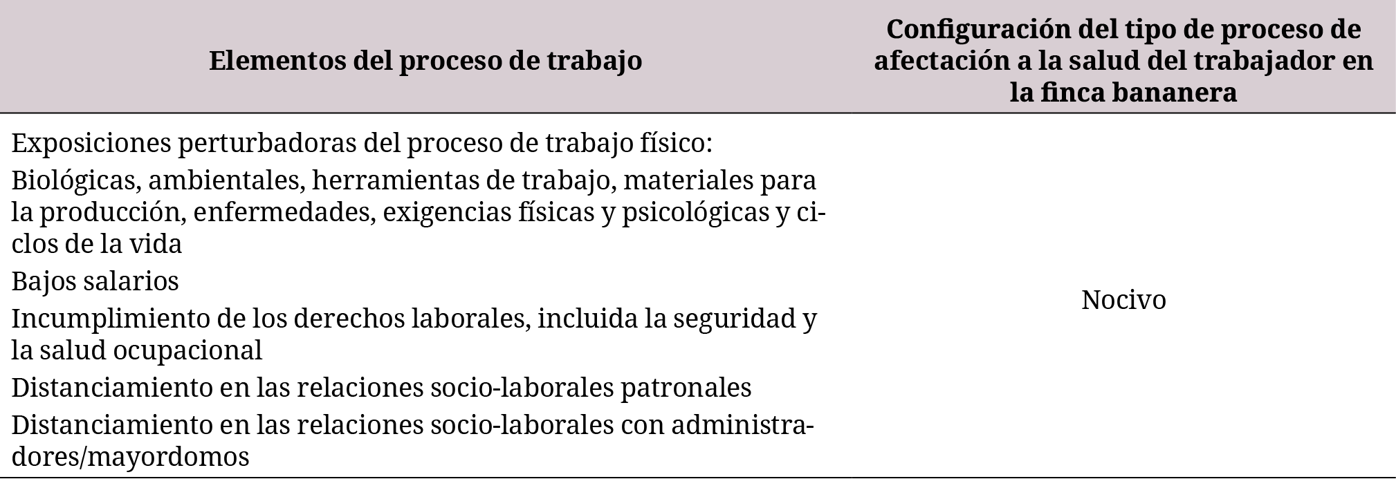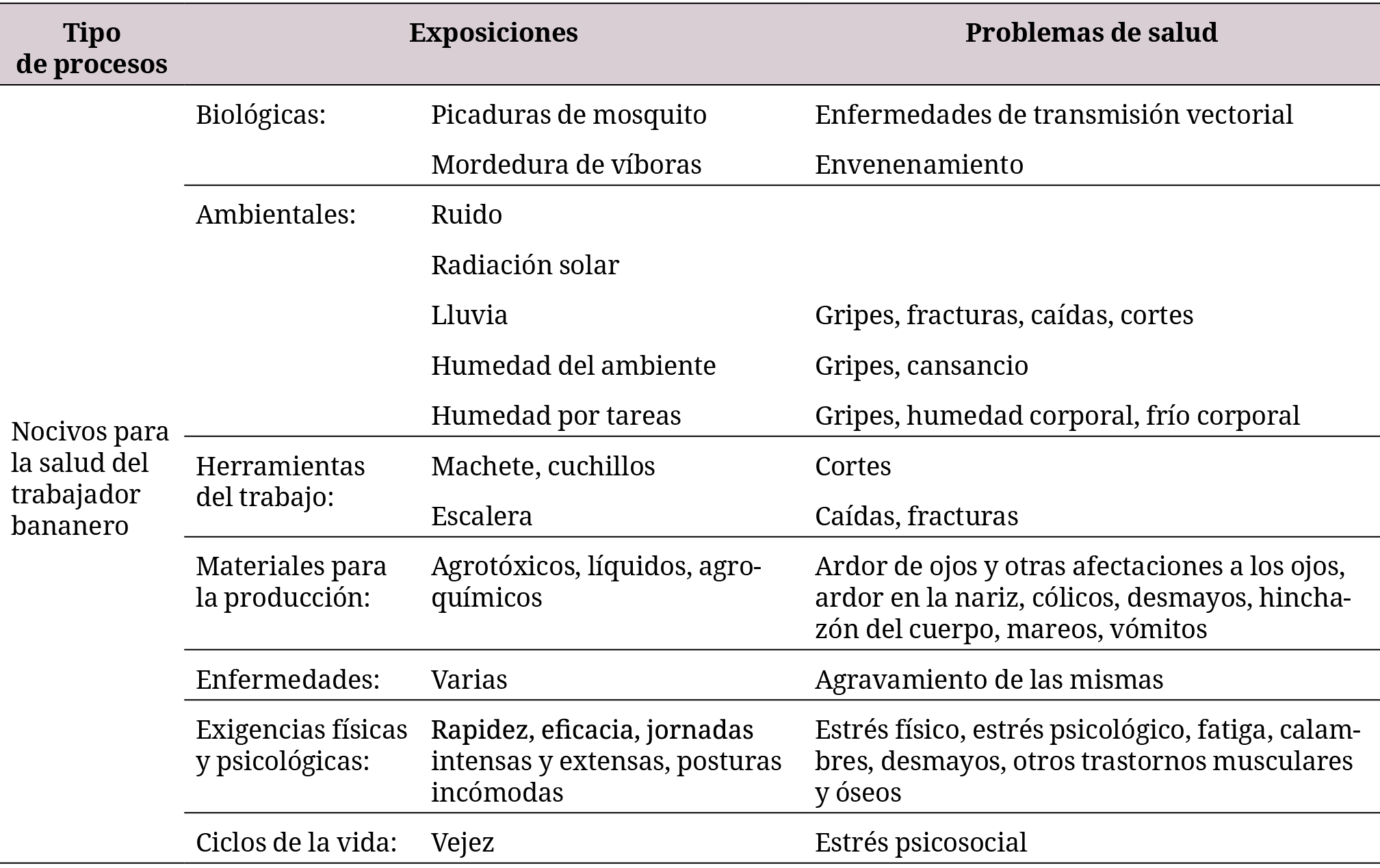 Para el trabajador de banano, en el territorio de la finca, existen procesos que son nocivos para su salud que se relacionan con el equipamiento de las fincas, las relaciones laborales y las relaciones sociales. Estos tres elementos son determinados en las relaciones de poder entre los dueños de las fincas bananeras, los administradores y los trabajadores. Debido a la falta de infraestructura adecuada y de equipo de trabajo, así como a la manipulación de agrotóxicos y agroquímicos, se generan procesos que perjudican la salud de los trabajadores (tabla 1 y tabla 2). Además, en las fincas bananeras, los trabajadores trabajan en ambientes que pueden ser riesgosos, como las condiciones climáticas, las cuales generan eventos patológicos estacionales cíclicos, y las exposiciones ambientales (tabla 1). Laurell expresa que las formas del trabajo son elementos determinantes de la existencia del trabajador (51); en el caso del trabajador de los cultivos de banano, las formas de trabajo impuestas en el interior de la finca por el propietario terminan no solo afectando su salud, sino que también determinan el deterioro de la reproducción social y material del trabajador y de su familia.