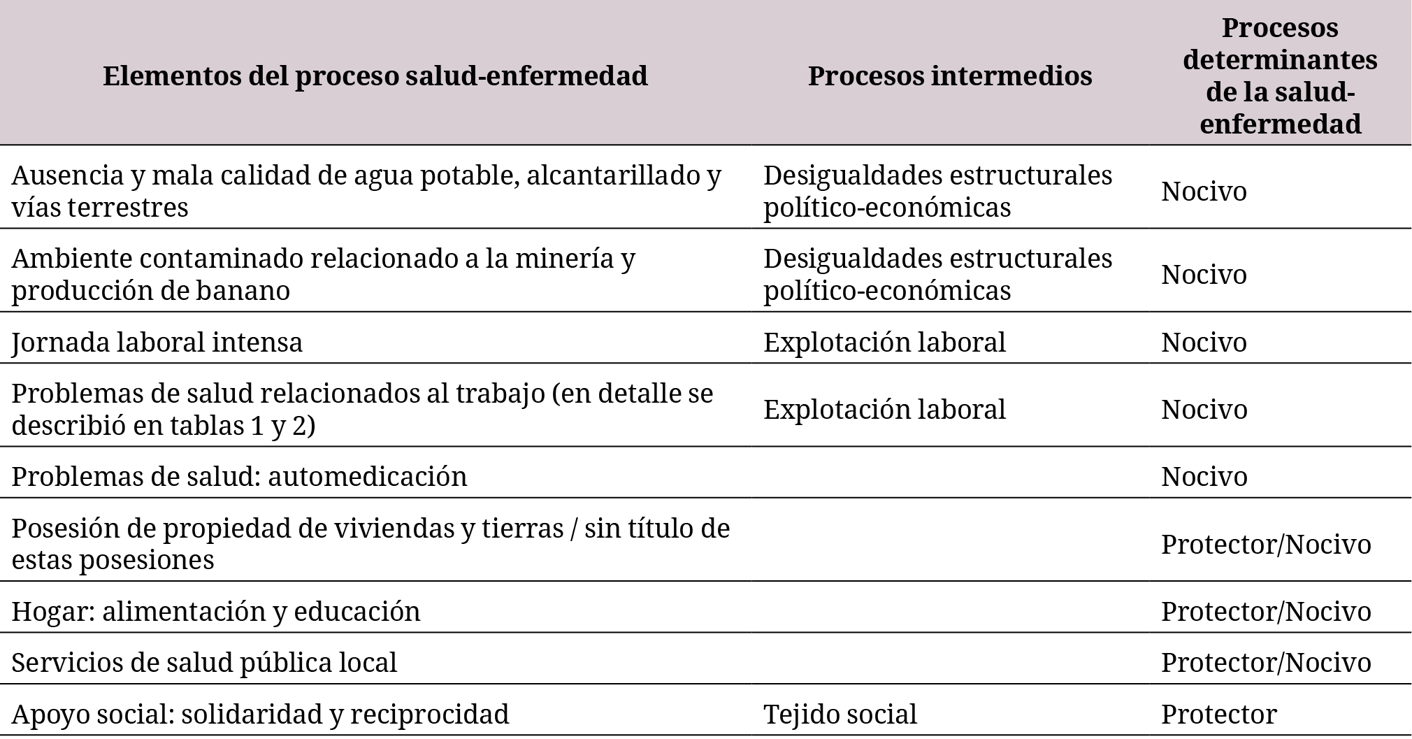 La posesión de una casa y, en algunos casos, de un terreno se percibe por los trabajadores como el o los únicos territorios en donde toman decisiones y a la vez se apoyan para sustentar la vida familiar. El terreno, además, les provee ingresos económicos adicionales a los trabajadores, los cuales se utilizan para suplir necesidades o emergencias, entre ellas, atender sus enfermedades o las de los miembros de su familia. La ocupación o posesión de un territorio por parte de grupos sociales marginados implica reivindicar su derecho a la vida, poseer una vivienda y afincar la posibilidad de sobrevivencia (57, 36). El territorio particular como posesión aporta al bienestar biopsicosocial del trabajador bananero y de su familia. En la tabla 3. se resumen los elementos descritos en esta sección que conforman los procesos que cuidan o no la salud de los trabajadores de los cultivos de banano.