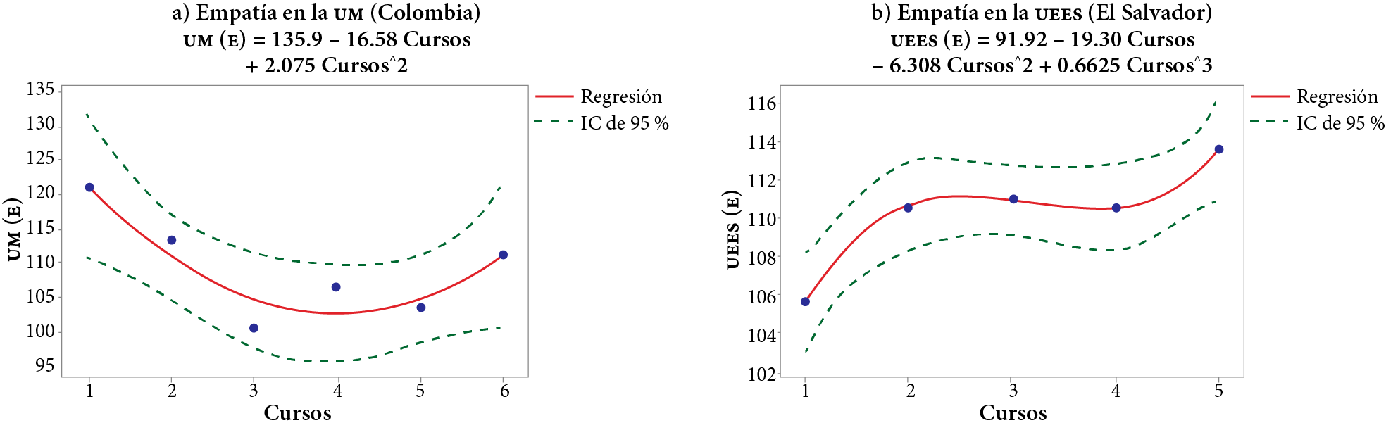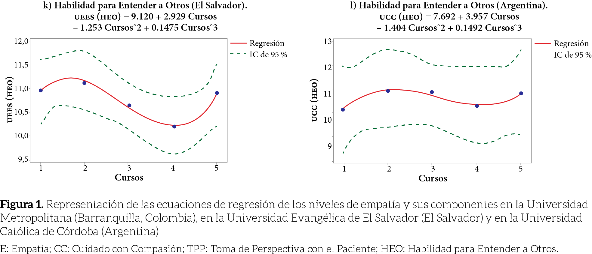 Figura 1. Representación de las ecuaciones de regresión de los niveles de empatía y sus componentes en la Universidad Metropolitana (Barranquilla, Colombia), en la Universidad Evangélica de El Salvador (El Salvador) y en la Universidad Católica de Córdoba (Argentina)