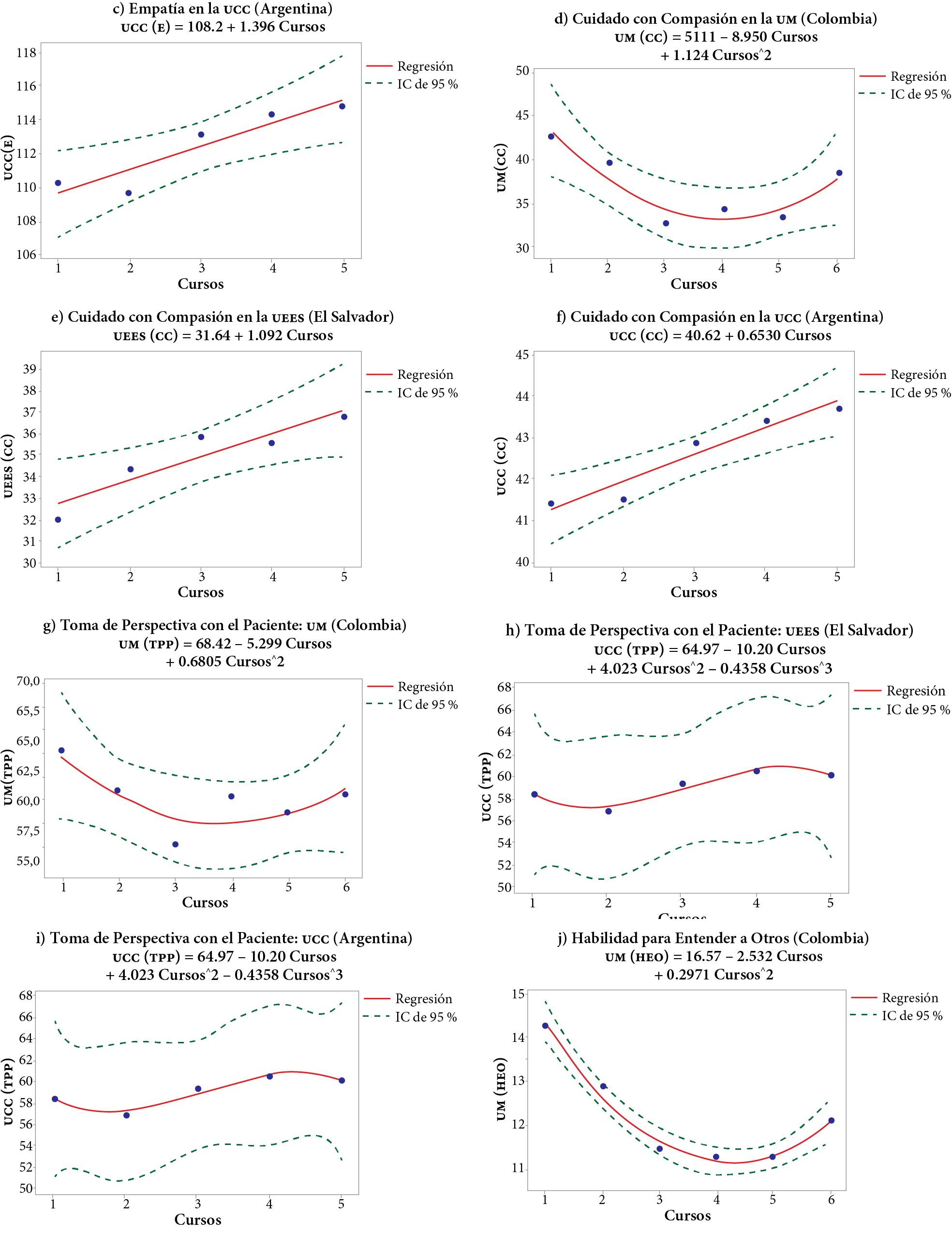 En la figura 1 se presentan los resultados de la estimación del tipo de curva de regresión a partir de las medias observadas en la empatía, así como en cada uno de los componentes de la empatía, y en cada una de las universidades estudiadas. Se observaron familias de curvas: lineales, cuadráticas y cúbicas, tanto ascendentes como descendentes. Esto implica una variabilidad en la expresión de la distribución del comportamiento de las medias entre los años. Los resultados gráficos de las regresiones estimadas en la empatía (E) y de sus componentes cuidado con compasión (cc), toma de perspectiva del paciente (tpp) y habilidad para entender a otros (heo) se presentan en la figura 1. En la E se encontró que la curva de la UM (figura 1a) no responde exactamente al modelo de declinación (2): comenzó desde el segundo año de estudio y, posteriormente, del cuarto en adelante, se manifestó una tendencia al incremento de la empatía sin superar el nivel inicial de primer año. En la curva de la UEES (figura 1b) se produce un aumento, seguido de cierta “estabilidad” y luego un aumento nuevamente; estos resultados no concuerdan con el modelo de declinación (2). En la UCC (figura 1c) los valores de empatía responden a una curva lineal positiva; por tanto, tampoco responden al modelo antes referido.