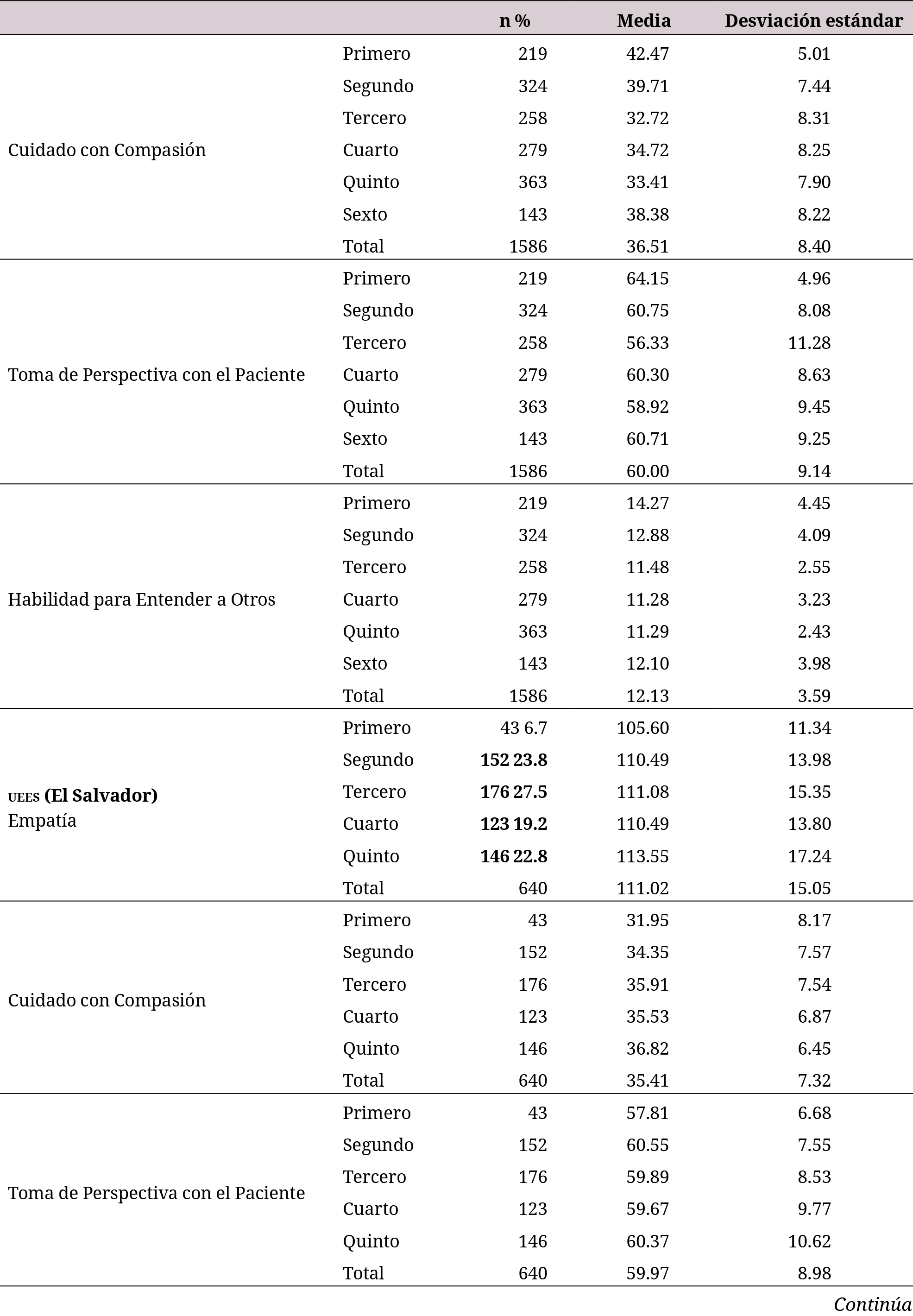 Los hallazgos encontrados contribuyen a abrir el camino en relación con que deberían existir factores atribuibles que modulen contextualmente la empatía en interacción con los factores ontogénicos específicos (6, 15, 17); de otra manera, no podría explicarse tal variabilidad. En consecuencia, si se requiere incorporar la empatía en los programas de medicina, es necesario, antes que todo, una potente descripción del comportamiento empático antes de cualquier intervención (43), y sobre la base de los resultados empíricos encontrados, dicha descripción, en sí misma, constituye una acción capaz de generar conocimiento nuevo. Se precisa un estudio profundo de las causas que originan tales distribuciones, identificarlas y, en concordancia con el conocimiento de ellas, modificar el currículo, modificar los métodos de enseñanza-aprendizaje, cambiar la concepción de los profesores, indagar en el currículo oculto, entre muchas otras posibles.
