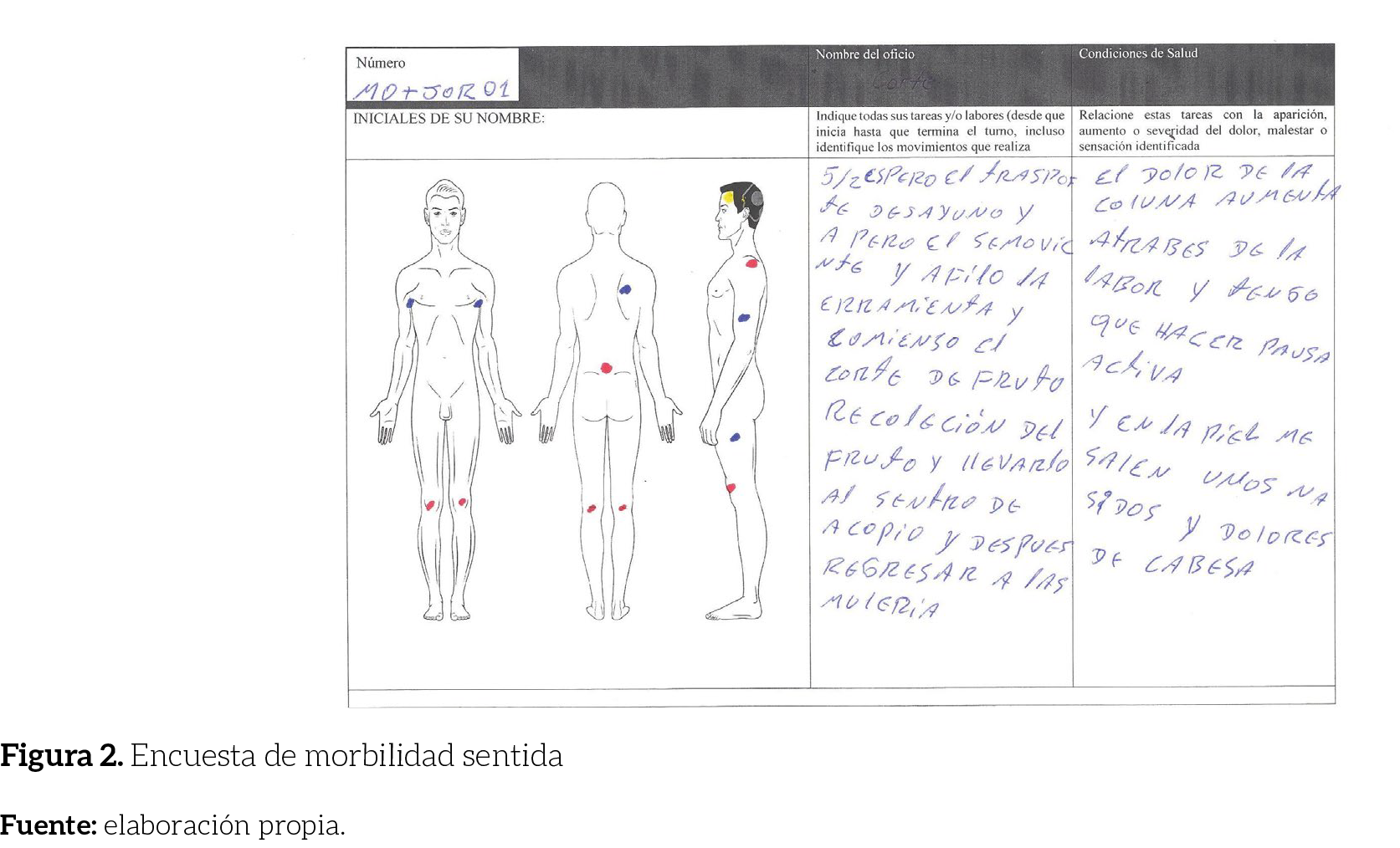 La “morbilidad sentida”, como método de investigación en el ámbito sindical, tiene una larga tradición en América Latina (11, 12). Consiste en un instrumento visual de autoreporte de salud y enfermedad (figura 2) inspirado en el cuestionario nórdico de síntomas osteomusculares. El instrumento incluye una silueta del cuerpo y dos columnas en las que el entrevistado describe su propia experiencia de salud-enfermedad mediante la identificación de las tareas y labores además de la relación posible entre dichas tareas y las sensaciones de dolor, malestar o incomodidad física y mental.