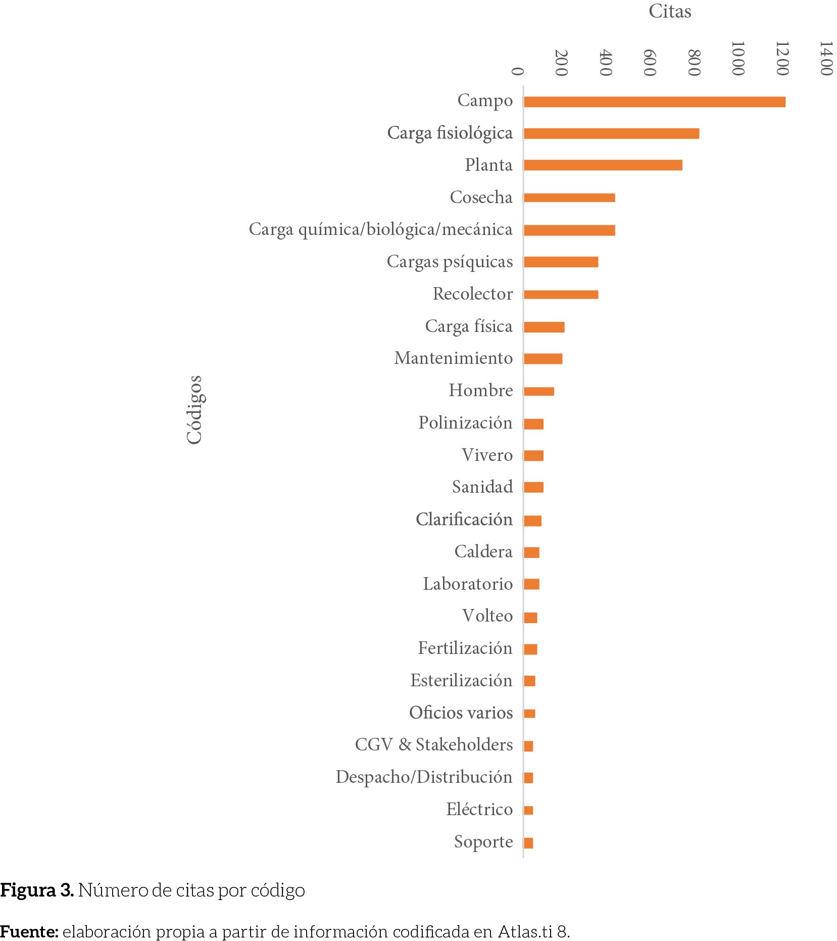 En el análisis sistemático de la información se percibe que, según los trabajadores y las trabajadoras de la palma, en su labor predominan, por un lado, las cargas físicas (mencionado 105 veces en las transcripciones de los grupos focales), las químicas (423 veces) y las fisiológicas (805 veces); por otro, las cargas psíquicas (350 veces). En las entrevistas grupales, así como en las fichas de “morbilidad sentida”, los trabajadores y las trabajadoras expresaron el riesgo por las altas temperaturas, especialmente en la planta, por la proximidad con la caldera o en la centrífuga, donde la temperatura ambiente es muy alta, dado que esta debe superar los 100 °C para su adecuado funcionamiento, o porque a la temperatura de los vagones, al salir del proceso de esterilización, se suma la presencia de vapor.