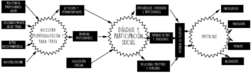 Visualizando las categorías como un proceso, encontramos el primer grupo de categorías que son antecedentes de la necesidad de despatologización y buen trato. Desde esta categoría se desprenden el activismo y empoderamiento y la apertura de profesionales, que en conjunto con la legislación chilena llevan al diálogo y la participación social. Gracias al trabajo entre la comunidad trans y los proveedores de salud, caracterizado por los aprendizajes, el trabajo activo y vinculante y las relaciones positivas y cercanas, surge el protocolo. A continuación, se presentan sus antecedentes de manera resumida, seguidos de la descripción y sus características principales; después la matriz foda, realizada sobre el protocolo.