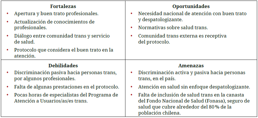 En primer lugar, se tienen las fortalezas, que son aspectos positivos internos del protocolo mismo. Aquí se encuentran la apertura y buen trato de profesionales del sst, esto es, reconocer el desconocimiento de salud trans existente. Esto se asocia con la disposición positiva del equipo profesional, que buscó cómo sensibilizarse y aprender más, con lo que se facilita la buena atención hacia las personas trans. Un reflejo claro, entonces, es la actualización de conocimientos, gracias al reconocimiento de su desconocimiento. Se optó por superar el desconocimiento, en vez de pasar por alto la problemática y así poder entregar una mejor atención a la comunidad trans. Lo anterior permitió que se planteara la necesidad de un protocolo, reconociéndose la relevancia de estandarizar la atención.