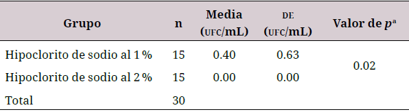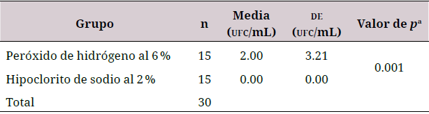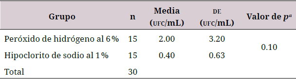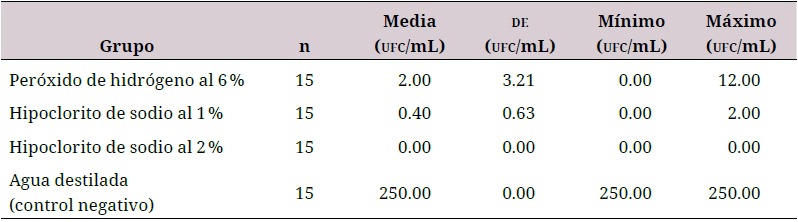 Las ufc con el agua destilada (control negativo) fueron 250×109ufc/mL. Con respecto al peróxido de hidrógeno al 6%, se obtuvieron 12×109ufc/mL. De la misma manera, respecto al hipoclorito de sodio al 1%, se obtuvo el máximo de 2×109ufc/mL y para la concentración del 2%, se obtuvo 0 ufc/mL (tabla 1).