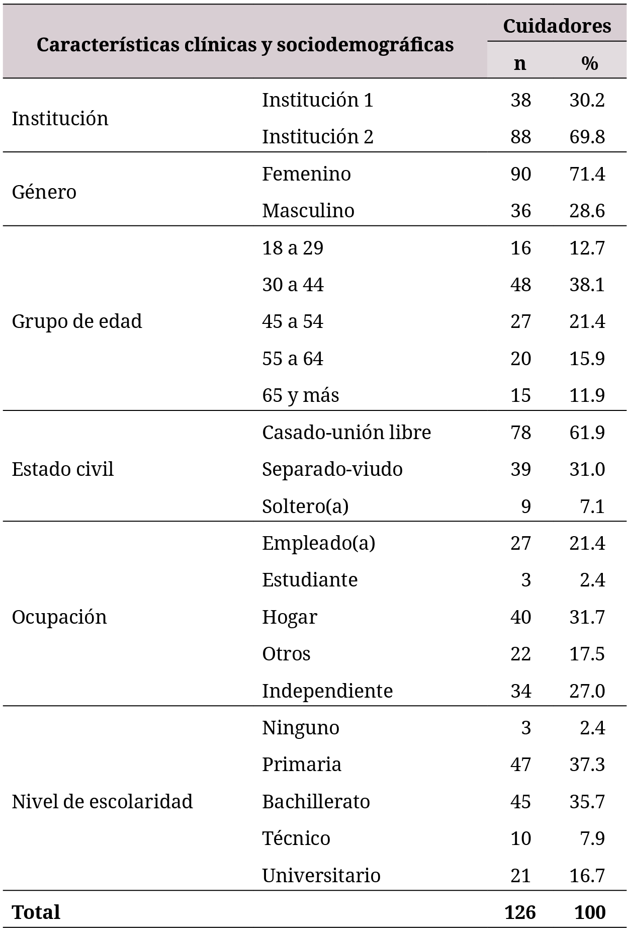 De los 126 cuidadores familiares captados, el 71 % perteneció al género femenino, el 38 % de los cuidadores se encontraba dentro del rango de edad de 30 a 44 años, el lugar de residencia fue el urbano (representado en un 83 %), un 62 % estaba casado o se hallaba en unión libre, un 32 % se dedicaba al hogar y en escolaridad predominó la primaria, con un 37 % (tabla 1).