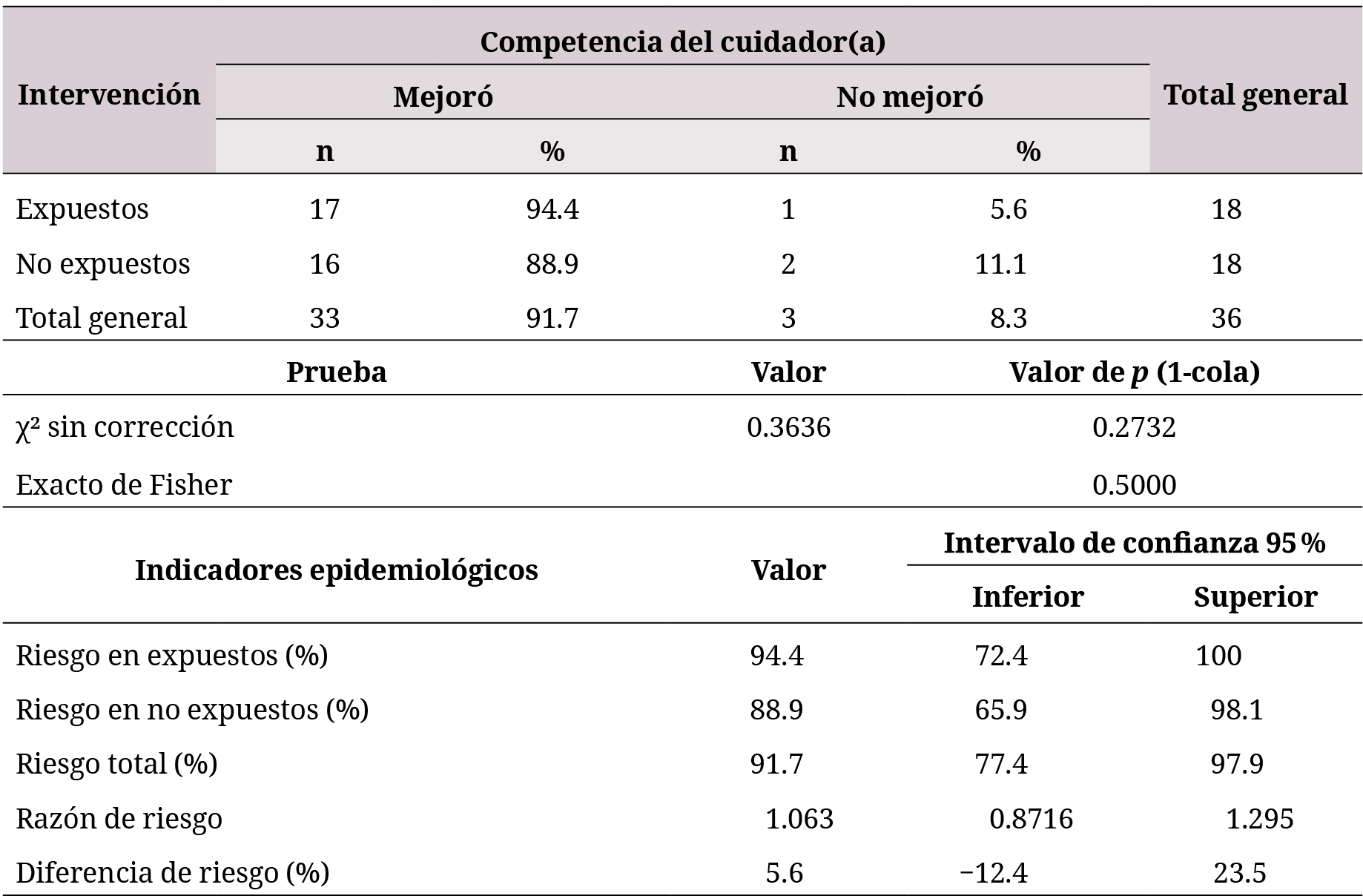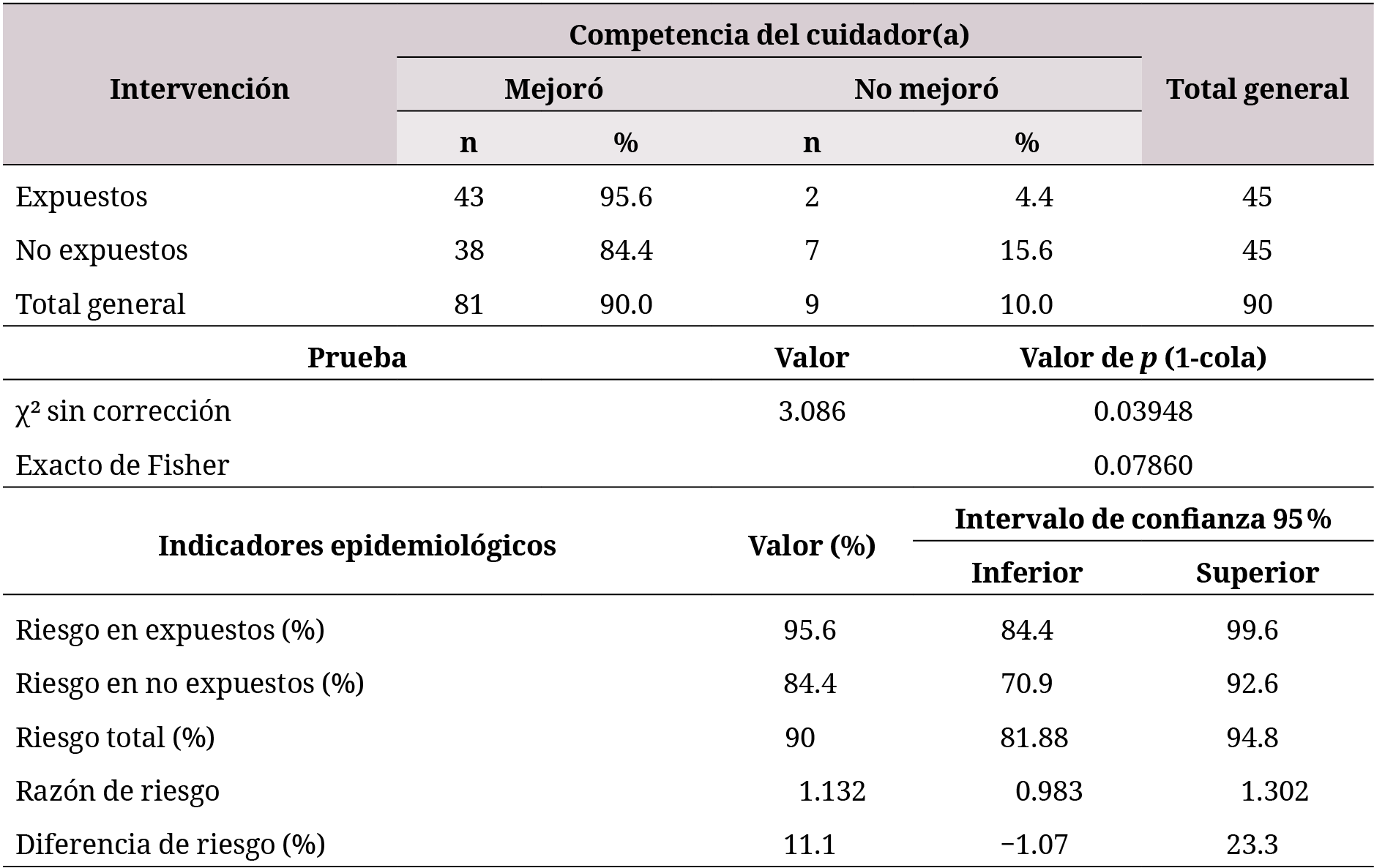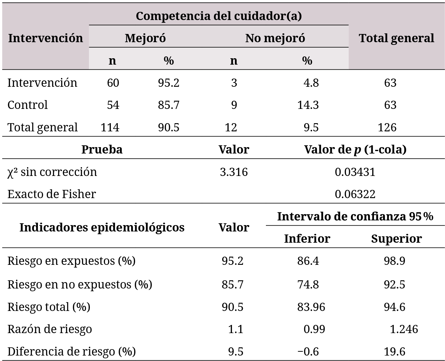 Al evaluar por medio de la prueba χ², sí existe relación entre el tipo de intervención y la mejoría en las competencias el cuidador y se rechaza, en este sentido, la hipótesis nula (Ho: no hay relación entre el tipo de intervención y la mejoría en la competencia del cuidador). Al analizar la razón de riesgo, indica que hay un 10 % más de probabilidad de mejorar las competencias del cuidador en población intervenida frente a la no intervenida. En cuanto a este resultado, los investigadores consideran que pudo influir el tiempo que se empleó la aplicación de la intervención educativa o, por otro lado, el plan de egreso utilizado por la institución, que estuvo bien fundamentado, al abarcar aspectos considerados dentro de la cartilla educativa utilizada en la investigación. Sin embargo, los estudios respecto al componente educativo versus cuidador de paciente crónico revelan que se evidencian cambios en el comportamiento, porque toman con más responsabilidad la labor de cuidado.
